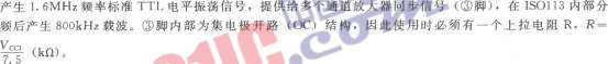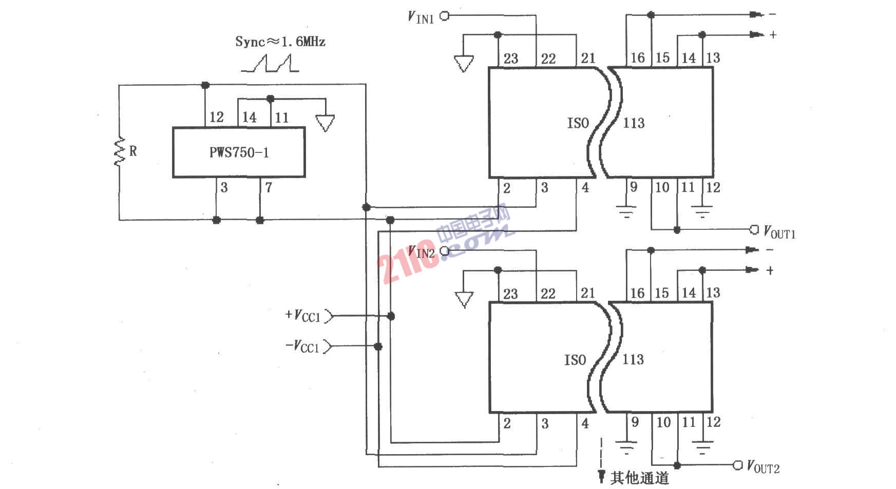 如圖所示為由ISO113與PWS750-1構(gòu)成的多通道同步隔離電路。該電路中采用PWS750-1振蕩器