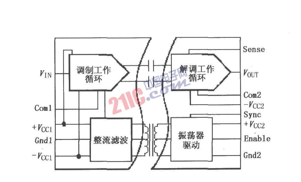 ISO107隔離放大器通過隔離柵提供信號和電源,采用陶瓷側(cè)邊引腳混合封裝,內(nèi)部包括了一個變壓器耦合DC/DC變換器和一個電容耦合信號通道。其電源是利用隔離輸入側(cè)的外部調(diào)整電路提供,一個內(nèi)部電流限制電路在當變換器對地短路時進行保護,軟啟動特性限制電源啟動時的初始電流,多通道同步可以將TTL時鐘信號應用于并行同步腳。在保持信號解調(diào)器有效狀態(tài)下,使能控制可關斷發(fā)送驅(qū)動器,這個特性可方便地用于低功率應用場合以減小靜態(tài)電流。寬的隔離腳距和內(nèi)部絕緣使得其對2500Vrms連續(xù)AC額定隔離等級有足夠的裕量,符合UL544測試方法的100%隔離柵破壞性試驗確保了其可靠性。低隔離柵電容使AC漏電流最小。ISO107使用方便,可用于像PC機這樣緊湊結(jié)構(gòu)的電路板設計。ISO107的引腳排列如圖所示。