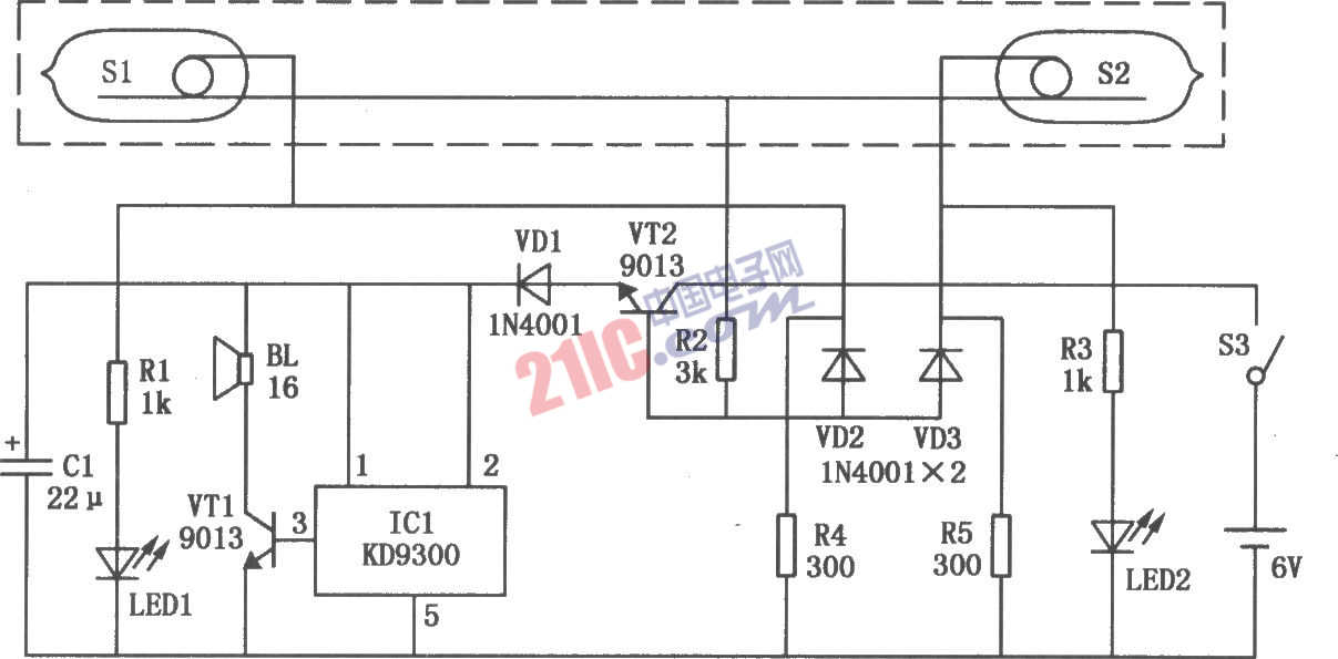 普通水平儀是靠觀察水平尺中心空氣泡是否在其中心位置,來(lái)確定被測(cè)物體平面是否達(dá)到了水平。在光線較暗的環(huán)境里,肉眼不易看清物體,就難以準(zhǔn)確判斷。電子水平儀用聲光的變化來(lái)指示物體平面是否達(dá)到水平,從而可在任何亮度的環(huán)境中進(jìn)行測(cè)量,使用十分方便。如圖所示為電子水平儀電路。