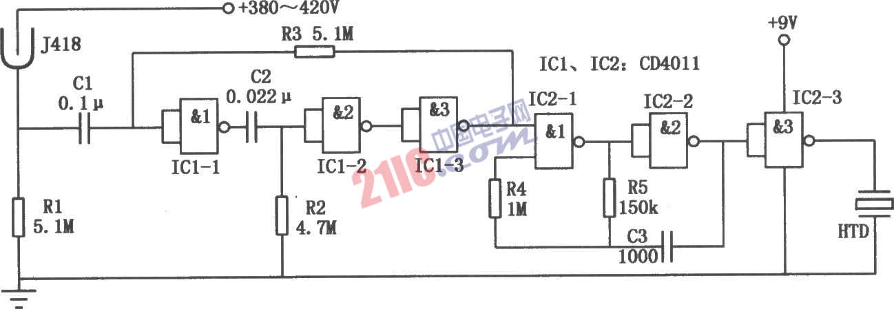 如圖所示為放射線檢測儀電路。它主要由放射線檢測傳感器及二輸入端四與非門集成電路CD4011等元件組成,可以用來檢測α、γ、β和X射線,具有較高的靈敏度。當檢測到小劑量的放射線時,檢測儀會發(fā)出斷續(xù)的報警聲;當檢測到劑量大于規(guī)定值時,儀器可發(fā)出連續(xù)的報警聲。