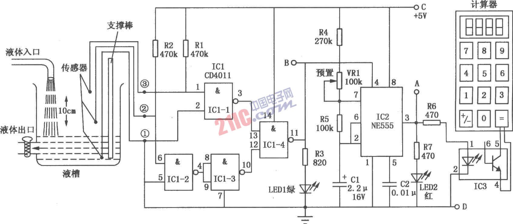 簡易流量表由傳感器、邏輯控制器、脈沖發(fā)生器和開關(guān)模塊等4部分組成,其電路如圖所示。