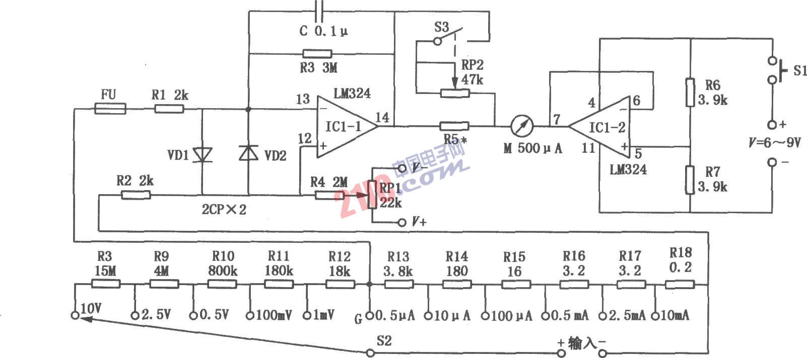 教學(xué)中常用的大型演示電表,其靈敏度低,缺少低電壓、小電流擋。在需要精確測(cè)量低電壓、小電流的實(shí)驗(yàn)中,由于存在較大的誤差,難以達(dá)到令人滿意的實(shí)驗(yàn)效果。本電路使用運(yùn)放集成電路來(lái)提高靈敏度,從而彌補(bǔ)了以上不足。本電表可應(yīng)用于以下實(shí)驗(yàn):閉合電路的歐姆定律;晶體三極管的電流分配和放大作用;通過(guò)測(cè)量,找到金屬導(dǎo)線的電阻與導(dǎo)線長(zhǎng)度、橫截面積及材料的關(guān)系;電路端電壓與外電路電阻的關(guān)系;電池的串聯(lián)和并聯(lián);伏安法測(cè)電阻;用電流表和電壓表測(cè)電池的電動(dòng)勢(shì)和電阻;單根導(dǎo)線切割磁力線產(chǎn)生感生電流。高靈敏度演示電表電路原理如圖所示。