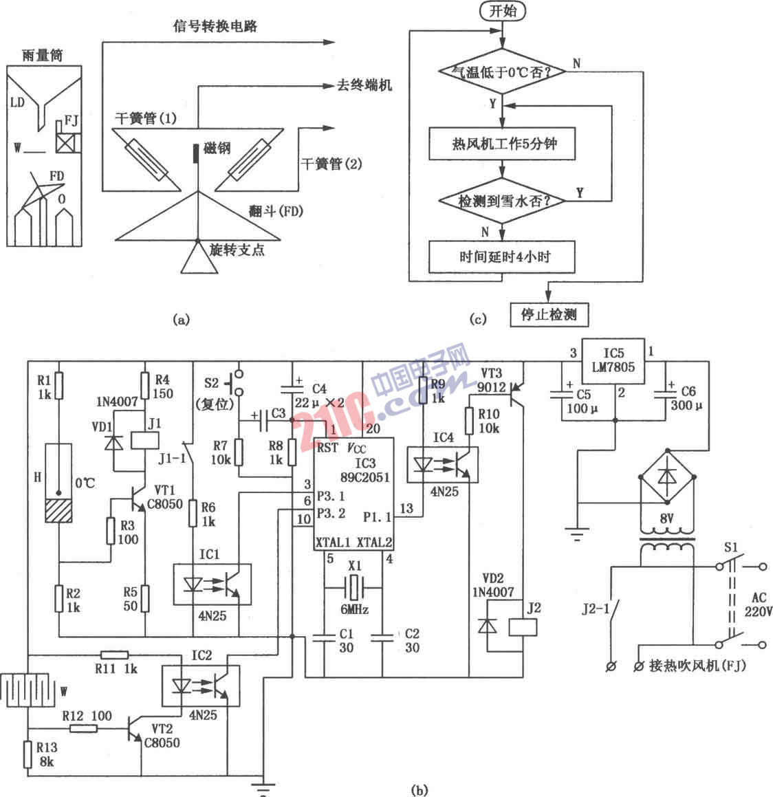 冬季推測(cè)水情不僅需要測(cè)量降雨量,還要測(cè)量降雪量。本電路在原雨量遙測(cè)電路的基礎(chǔ)上,增加一些部件就可實(shí)現(xiàn)測(cè)量雨雪降落量的雙重功能,如圖所示。降雨時(shí),雨水經(jīng)圖(a)中雨量筒的漏斗LD流到下面的翻斗FD內(nèi)。當(dāng)一側(cè)翻斗正好收集到1mm雨 量時(shí),翻斗失去平衡翻動(dòng),翻斗內(nèi)的雨水也隨之排掉,同時(shí)另一側(cè)翻斗開始收集雨水。持續(xù)降雨時(shí),翻斗左右不停翻動(dòng)。在圖(a)的信號(hào)轉(zhuǎn)換電路中,翻斗中桿帶有磁鋼,翻斗左右翻動(dòng)時(shí),干簧管(1)與干簧管(2)交替吸合、斷開,給終端機(jī)送信號(hào),再由終端機(jī)通過載波向中心站傳送雨量數(shù)據(jù)。本電路的制作先在雨量筒內(nèi)增加一個(gè)熱吹風(fēng)機(jī)FJ,直吹漏斗。漏斗口下水平安裝一個(gè)鋼絲網(wǎng)W。溫度開關(guān)H安裝在雨量筒外1m處,電路板放置在雨量筒內(nèi)。雨雪降落量遙測(cè)電路如圖(b)所示。IC3是單片機(jī)89C2051,其P3.1端是溫度檢測(cè)口,P3.2端是雪水檢測(cè)口,P1.1端是風(fēng)機(jī)工作條件控制口。由于溫度開關(guān)H觸點(diǎn)設(shè)在0℃刻度處,氣溫高于0℃時(shí),三極管VT1導(dǎo)通,繼電器兒工作,其常閉觸點(diǎn)J1-1斷開,光耦IC1不通,IC3因P3.1置位而停止檢測(cè)。氣溫低于0℃時(shí),三極管VTl斷開,J1不工作,J1-1接通,光耦I(lǐng)Cl導(dǎo)通,P3.1端呈低電位,IC3開始檢測(cè)是否下雪,同時(shí)P1.1呈低電位,光耦I(lǐng)C4導(dǎo)通,繼電器J2工作,其常開觸點(diǎn)J2-1閉合,熱風(fēng)機(jī)工作。如雨量筒漏斗上無雪(即無降雪發(fā)生),P3.2置位,熱風(fēng)機(jī)工作5分鐘停止,4小時(shí)后又開始工作,如此反復(fù)。如果天空開始下雪,則由熱風(fēng)機(jī)加熱后的漏斗使雪融化,如果有雪水水滴流經(jīng)鋼絲網(wǎng)W一次,W導(dǎo)通而使三極管VT2導(dǎo)通,繼而光耦IC2導(dǎo)通,P3.2呈現(xiàn)一次低電位,熱風(fēng)機(jī)工作5分鐘。連續(xù)水滴流經(jīng)W時(shí),P3.2持續(xù)呈現(xiàn)低電位,熱風(fēng)機(jī)連續(xù)工作,直到不再有水滴流經(jīng)w為止。程序流程圖見圖(c)所示。如在熱風(fēng)機(jī)不工作的4小時(shí)內(nèi)有降雪,根據(jù)當(dāng)?shù)氐某D杲笛┝?,不?huì)使雨量筒降滿雪,因此不會(huì)產(chǎn)生誤差,只是降雪測(cè)量有延遲。一定的時(shí)間延遲,對(duì)測(cè)量降雪量沒有多大影響。冬季過后,可人工斷開Sl,停止測(cè)量雪量功能。