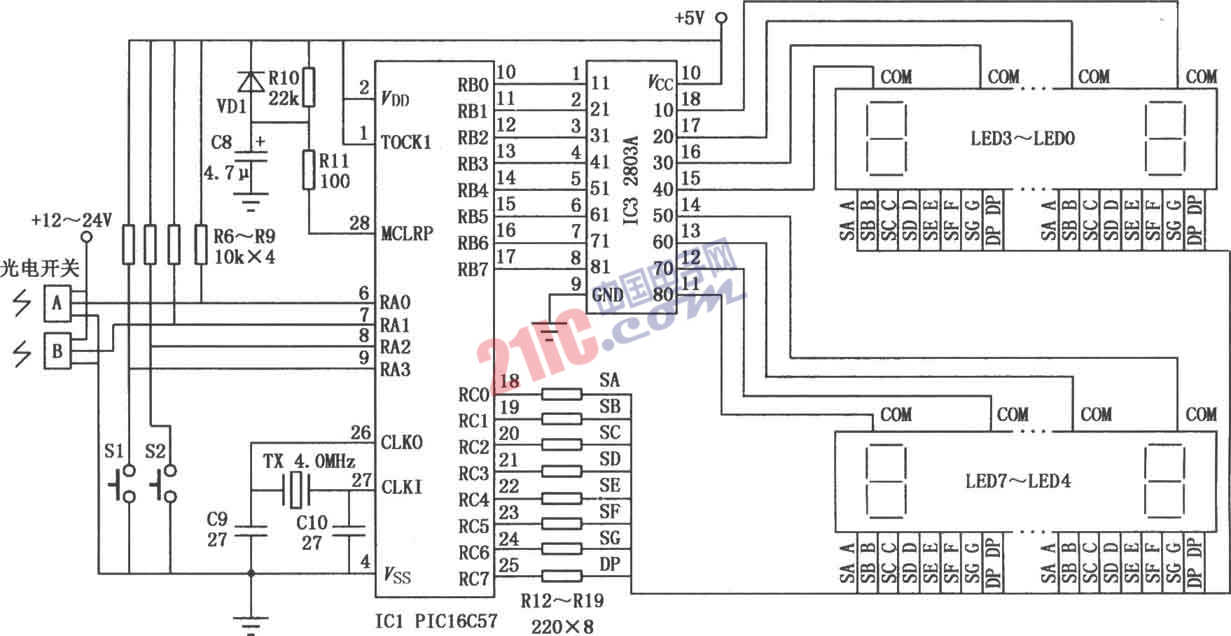 光電式自動點數(shù)器電原理見圖。它用單片機PIC16C57制成,非常適合工業(yè)自動化生產(chǎn)線,具有一定的實用價值。