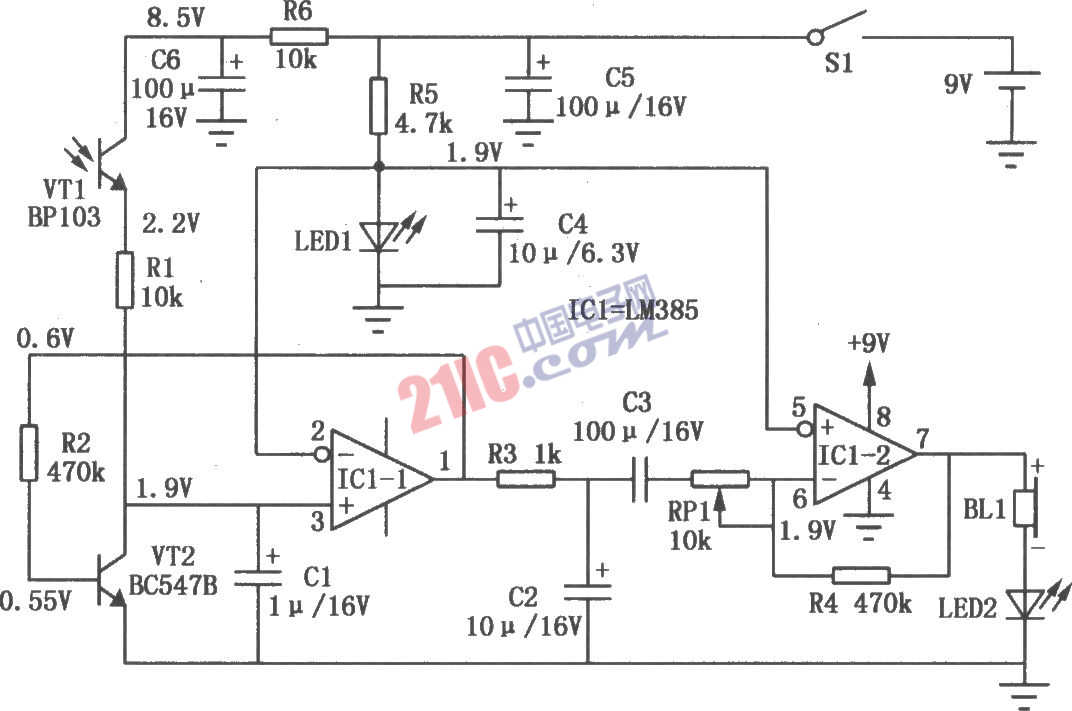 人員接近探測器電路如圖所示。該電路采用普通光電管來探測人員進入警戒區(qū)域時引起環(huán)境光照變化,從而實現(xiàn)探測功能。