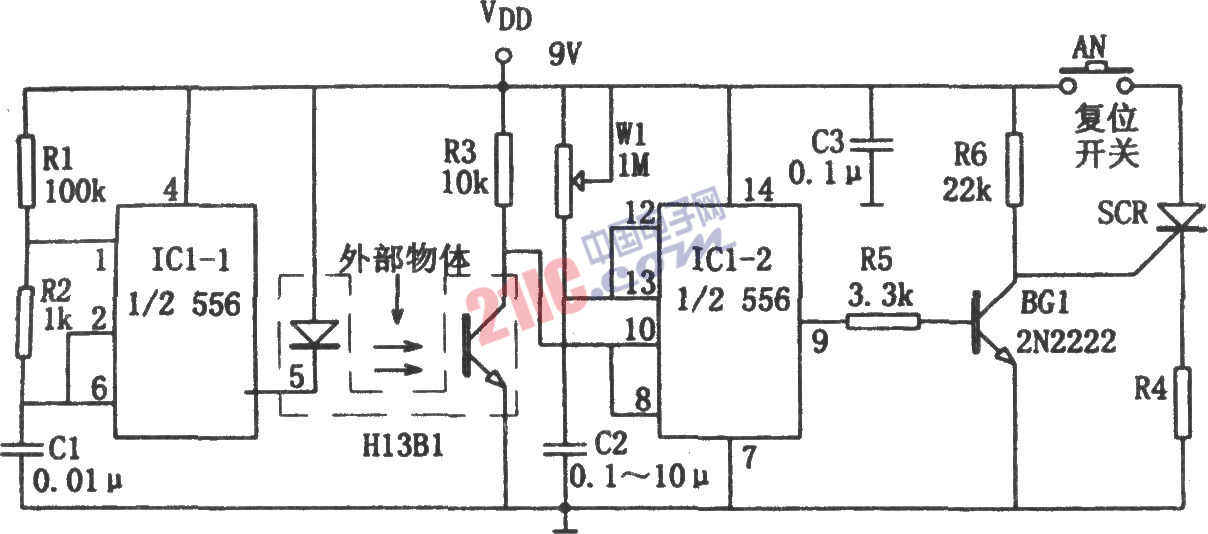 如圖所示為光電子脈沖遺漏檢測(cè)電路。該檢測(cè)器由光電子開(kāi)槽開(kāi)關(guān)H13B1、雙時(shí)基電路556與一些阻容元件構(gòu)成的單穩(wěn)態(tài)觸發(fā)器和多諧振蕩器等組成。光電子開(kāi)關(guān)H13B1內(nèi)的發(fā)光管和光敏管之間開(kāi)有一個(gè)幾毫米的槽縫。當(dāng)外界隔光物體插入其縫隙時(shí),H13B1內(nèi)部的光敏管因通道光束被切斷而呈高阻,使IC1-2(1/2 556)脈沖信號(hào)檢測(cè)器因得不到復(fù)位信號(hào)而輸出高電平,進(jìn)入暫穩(wěn)態(tài),相應(yīng)暫穩(wěn)時(shí)間為td=1.1RwlC2,且調(diào)節(jié)W1可改變td。若信號(hào)中斷時(shí)間大于暫穩(wěn)時(shí)間幻,則IC1-2復(fù)位,③腳輸出的低電平使BG1截止,可控硅SCR導(dǎo)通,相應(yīng)使負(fù)載RL得電,或?qū)㈦娫措娐窋嚅_(kāi),或發(fā)出報(bào)警信號(hào)。多諧振蕩器由IC1-1(1/2 556)和R1、R2、C1等組成,其振蕩頻率為f=1.44/(R1+2R2)C1,圖示參數(shù)對(duì)應(yīng)的頻率約為2.5kHz振蕩信號(hào)的占空比為99%,該高占空比的脈沖信號(hào)驅(qū)動(dòng)H13B1中的發(fā)光管發(fā)光。