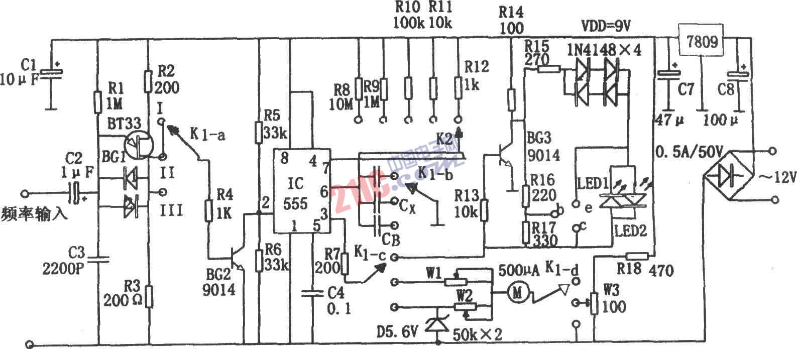 如圖所示為電容、頻率、晶體管在線檢測電路。本檢測器對電容、頻率、晶體管進行檢測時可通過調(diào)節(jié)預(yù)置開關(guān)K1來轉(zhuǎn)換。 將K1置于II可檢測電容。555和R8~R12及待測電容Cx組成單穩(wěn)定時電路,Cx容量越大,則脈沖越寬,即td=1.1(R8~R12)Cx越長,電流平均值越大,相應(yīng)表頭的指示越大。電路中BG1為單結(jié)晶體管,其與R1、C3組成弛張振蕩器,其輸出的振蕩脈沖信號作為IC的觸發(fā)脈沖。將K1置于III可進行頻率測量。此時單穩(wěn)電路IC輸出td'=1.1(R8~R12)CB的定值寬度的信號。輸入信號的頻率越高。IC被觸發(fā)的次數(shù)越多,則電流平均值越大,相應(yīng)表頭指示也越大。將K1置于I可進行在線晶體管測試。該原理類似于檢測電容。電路中晶體管BG1完成正負電源的轉(zhuǎn)換。隨著IC輸出高、低電平的交替變化,若發(fā)光二極管LED1、LED2依次發(fā)光,則說明晶體管是好的,否則晶體管是壞的。