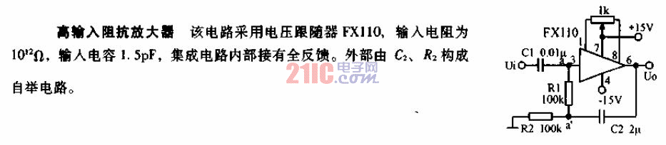 該電路是用于一個電壓式轉(zhuǎn)換器的高輸入阻抗交流放大器。輸入電阻是880M,可得到的增益是10。