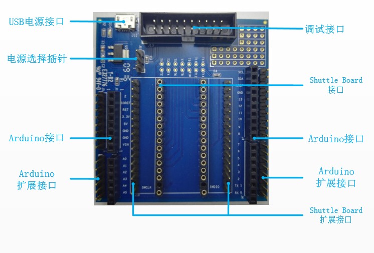 開發(fā)板提供了兩種供電方式,分別是由USB供電和Arduino 供電,可有由板上的插針選擇,如下圖: