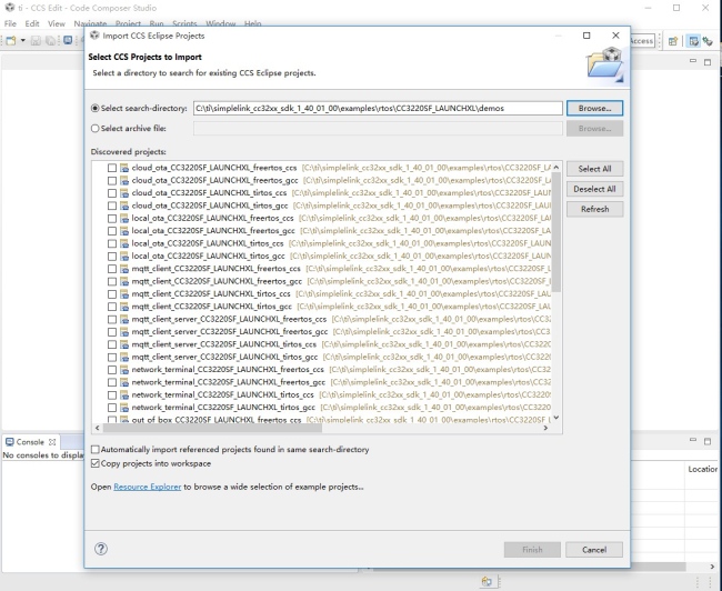 選擇工程路徑:C:\ti\simplelink_cc32xx_sdk_1_40_01_00\examples\rtos\CC3220SF_LAUNCHXL\demos,然后選擇需要導(dǎo)入的工程例子,然后點擊Finish導(dǎo)入工程。