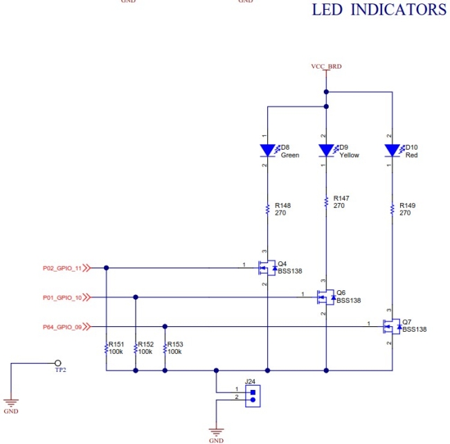 普通的N-MOS驅(qū)動LED電路,只是這里TI好像J24放的不好,單單把GND去掉,可能會導(dǎo)致IO電流倒灌,從電源上失效LED更為合理。