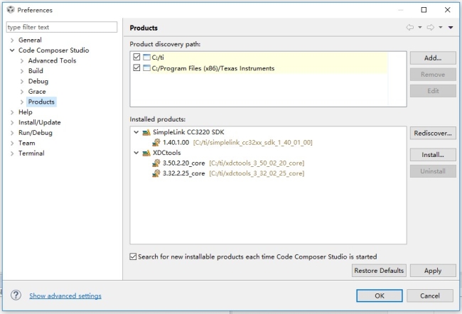 選擇Window>Preferences>Code Composer Studio>Products,確認SDK的路徑和XDCtools的路徑。
