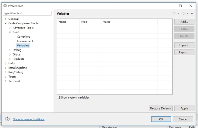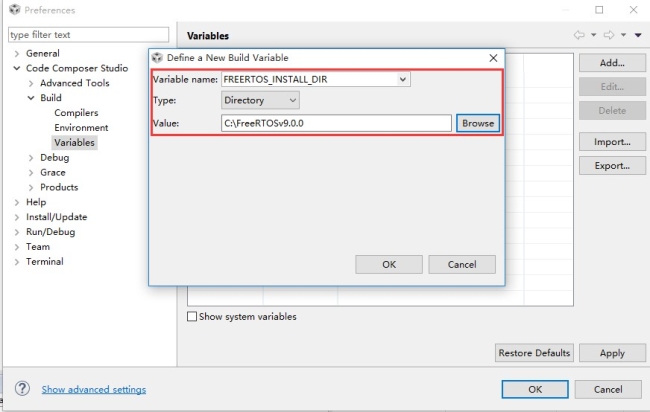 打開CCS,選擇Window>Preferences>Code Composer Studio>Build>Variables,添加CCS對FreeRTOS的支持。