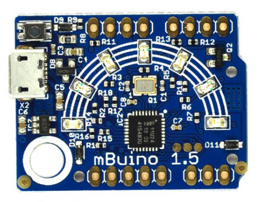 先讓我們一起來認(rèn)識一下我們的mBuino吧,一個micro USB接口,一個小小的QFN芯片,一個復(fù)位按鍵,外加半圓型的6顆LED,怎么樣很漂亮吧。