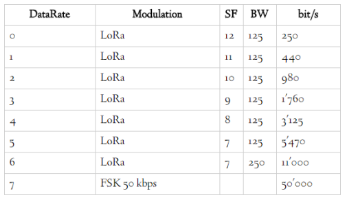 不同的擴(kuò)頻因子SF、帶寬BW及CR的組合,可以得到不同的傳輸速率,結(jié)合不同的發(fā)射功率,還可以選擇傳輸距離等