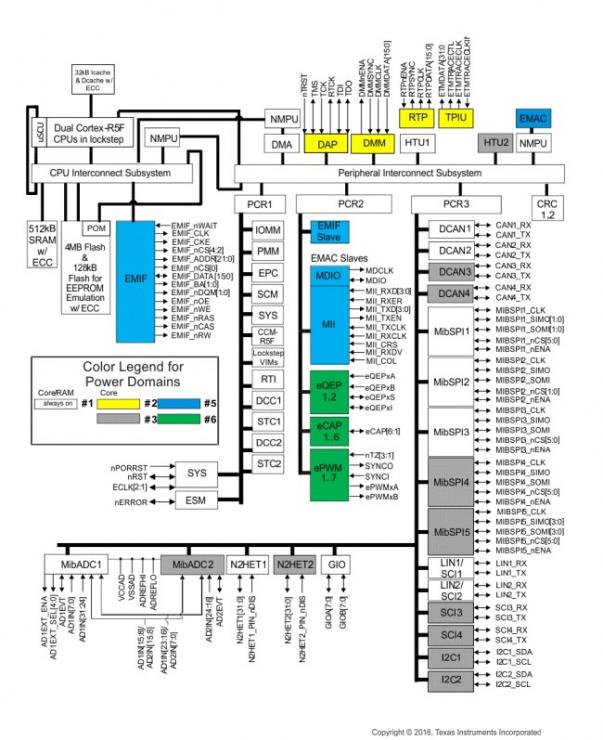 從官方提供的應用手冊,我們可以更直觀的看到RM57L843集成的各種外設功能,所有高亮的圖形表示處理器內部集成的外設。