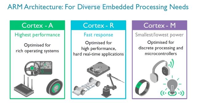 同時處理器針對嵌入式系統(tǒng)的實時應用進行了準們的優(yōu)化處理,相較于Cortex-A處理器應用更多的標準外設,相較于Cortex-M等低端處理器,又具有更強的系統(tǒng)處理能力及應用的針對性。