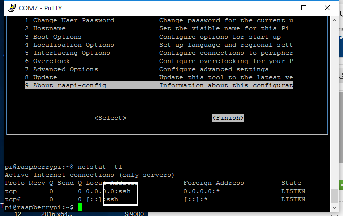 因為新版鏡像默認把SSH關閉,這里需要打開SSH,進入樹莓派配置模式,sudo raspi-config。