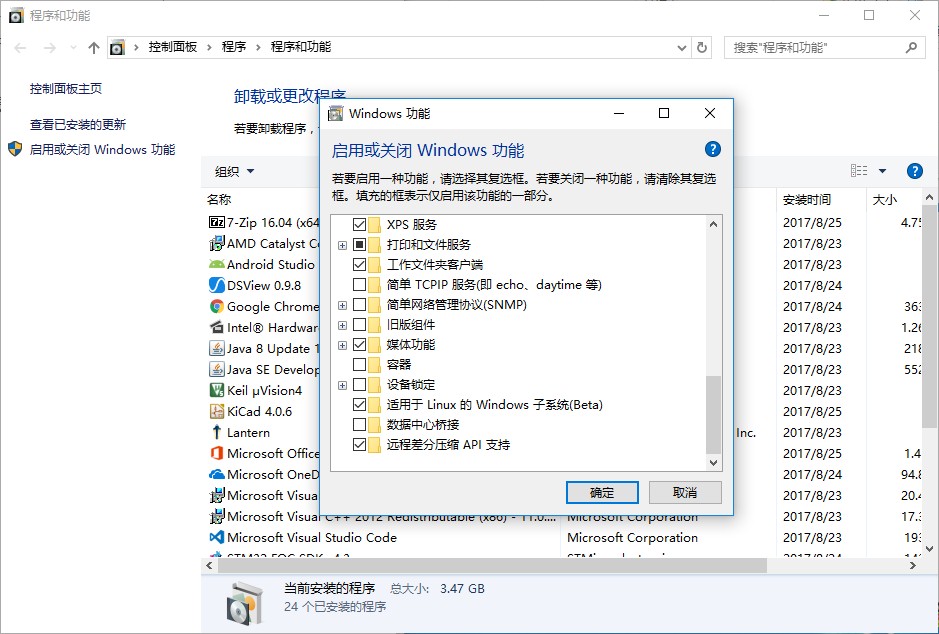 如上圖所示,打開控制面板,在程序和功能設(shè)置里啟用WSL,這里我們也可以看到,實(shí)際上這個(gè)應(yīng)用還處于Beta階段,不過就目前的使用情況來看,已經(jīng)比較穩(wěn)定了。