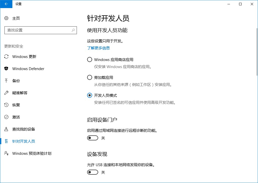 開發(fā)者模式為開發(fā)者安裝、測試Windows Universal Application提供了支持,如果你是一名Windows應(yīng)用商店程序開發(fā)者,這個(gè)模式應(yīng)該已啟用了。