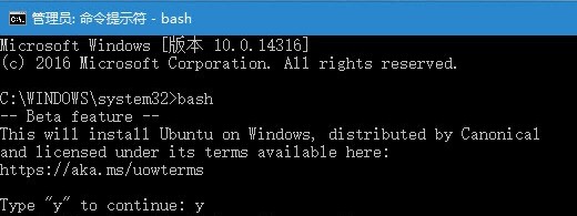 準(zhǔn)備工作完成得差不多了,接下來準(zhǔn)備將Linux系統(tǒng)安裝到Windows上。打開命令提示符,在提示符下輸入命令bash,會(huì)提示用戶按y鍵繼續(xù)