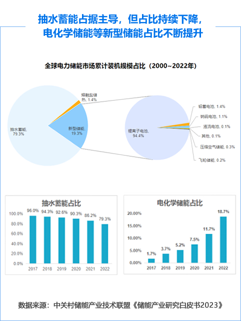 中國電力市場需求進(jìn)一步增大和非化石能源發(fā)電裝機(jī)量的容量和比例不斷增加給儲能的市場擴(kuò)容帶來更多發(fā)展空間。截至2022年底,全國已投運(yùn)新型儲能項(xiàng)目裝機(jī)規(guī)模達(dá)870萬千瓦,平均儲能時(shí)長約2.1小時(shí),比2021年底增長110%以上。其中,從2022年新增裝機(jī)技術(shù)占比來看,鋰離子電池儲能技術(shù)占比達(dá)94.2%,仍處于絕對主導(dǎo)地位,新增壓縮空氣儲能、液流電池儲能技術(shù)占比分別達(dá)3.4%、2.3%,占比增速明顯加快。此外,飛輪、重力、鈉離子等多種儲能技術(shù)也已進(jìn)入工程化示范階段。