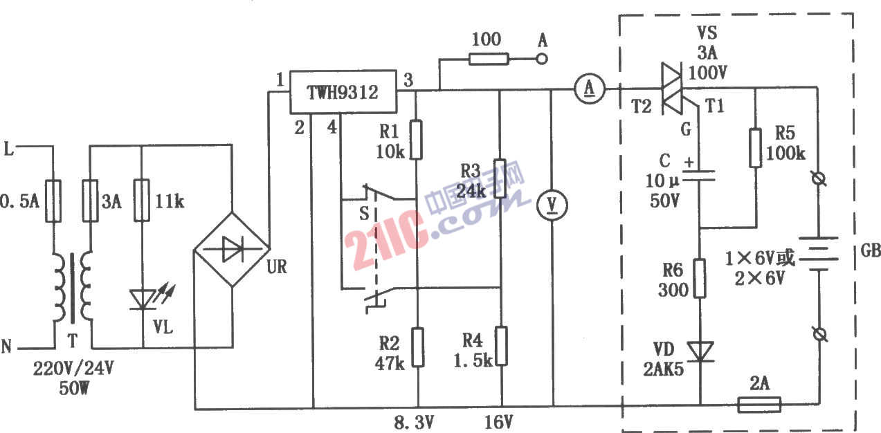 密封式鉛酸蓄電池充電電路,如圖所示。它一次可對(duì)l只或2只6V、4Ah的蓄電池進(jìn)行充電。穩(wěn)壓部分采用開關(guān)式穩(wěn)壓電源組件TWH9312,輸入電壓范圍寬;內(nèi)部還設(shè)有過(guò)流、短路保護(hù),工作安全可靠。