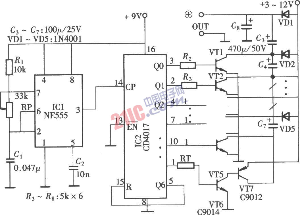 電子式倍壓、升壓電路在某些便攜式電子儀器中有著獨(dú)特的優(yōu)點(diǎn),這是由于它省去了通常升壓電路中所用的升壓變壓器,用集成電路和電容器取而代之。這就可減輕儀器的重量,也可提高電源的變換效率,電路組成如圖所示。該電路由脈沖振蕩器、脈沖分配器、晶體管開關(guān)電路、儲(chǔ)能電容器和隔離二極管組成。