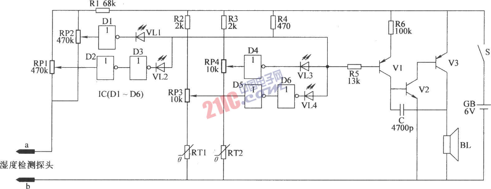 元器件選擇 R1~R6選用1/4W金屬膜電阻器或碳膜電阻器。 RTl和RT2均選用負溫度系數(shù)的熱敏電阻器(常溫下阻值為3kΩ左右)。 RP1~RP4均選用有機實心電位器。 C選用瓷介電容器或玻璃釉電容器。 VL1~VIA均選用φ3mm的高亮度發(fā)光二極管;VL1和VL3為綠色,VL2和VIA為紅色。 V1選用S9012或3CG21型硅PNP晶體管;V2選用S9011或3DG6型硅NPN晶體管;V3選用S8550或3CG8550型硅PNP晶體管。 IC選用CD4069或CC4069、MCl4069型六非門集成電路。 BL選用0.25W、812的電動式揚聲器。 GB使用小容量免維護蓄電池或4節(jié)5號電池。 S選用小型單極撥動式開關。 濕度檢測探頭的兩個電極使用1號干電池內部的石墨碳棒制作(用絕緣板固定,兩電極之間的距離為4cm,引線焊接在石墨碳棒的銅帽上)。