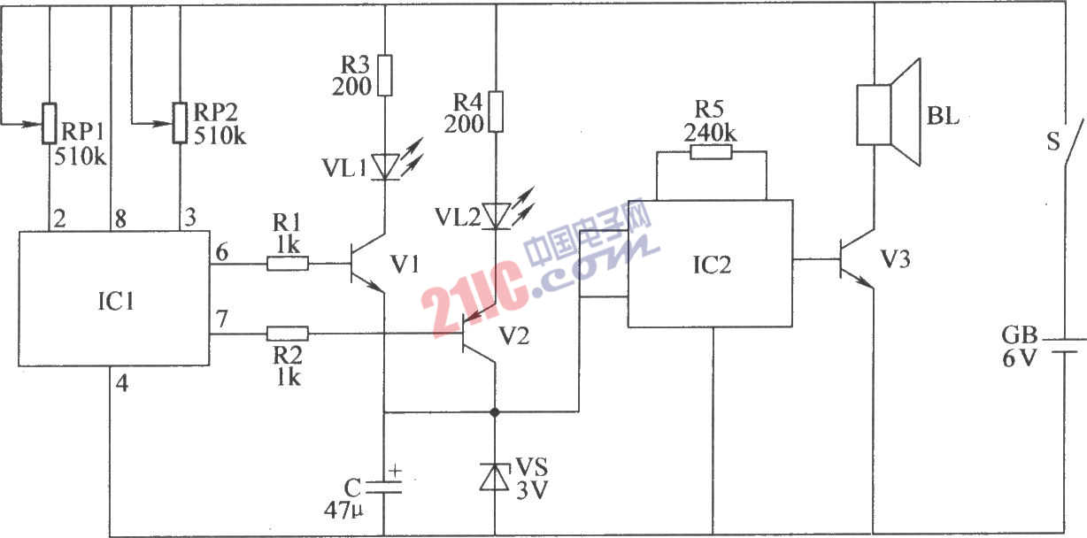 該雙限溫度報警器電路由溫度檢測控制電路、溫度指示電路和聲音報警電路組成,如圖所示。