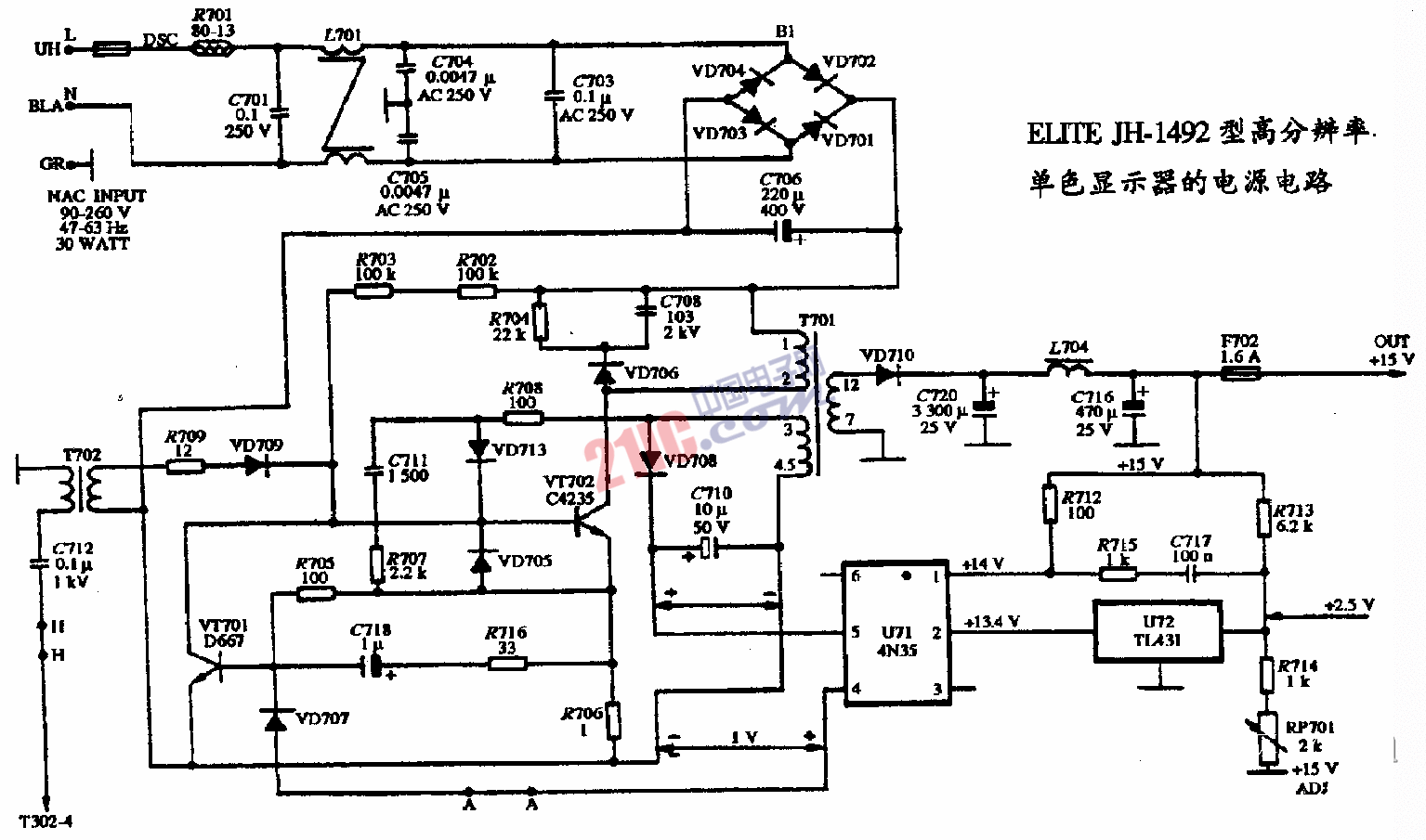 ELITE JH-1492型高分辨率單色顯示器的電源電路圖