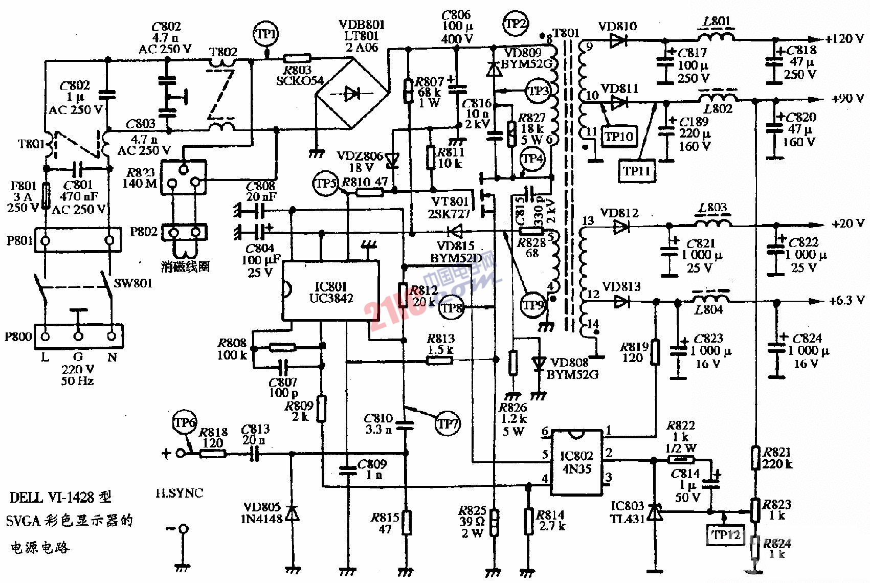 DELL VI-1428型SVGA彩色顯示器的電源電路圖