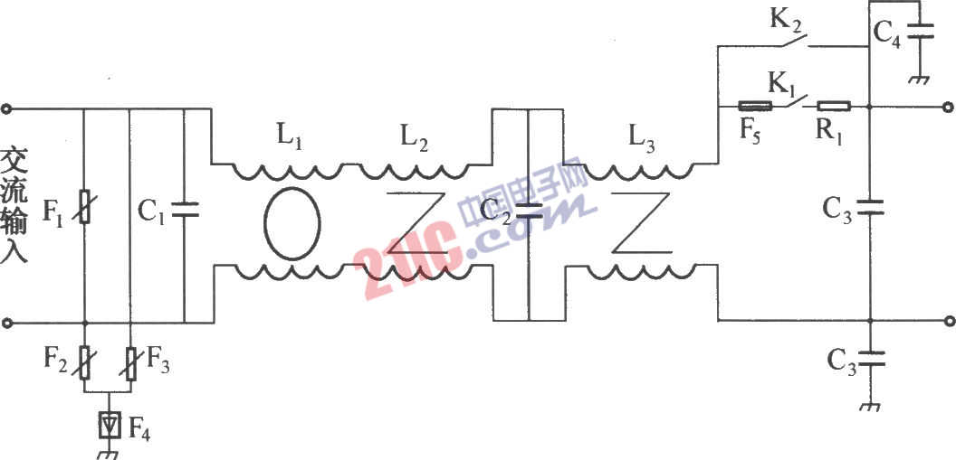 DMA12單相交流電壓經(jīng)由C3、L3和C1、L2、C2構(gòu)成的兩級(jí)差模濾波網(wǎng)絡(luò)和由與機(jī)殼相連的C4、C5和共模電感L1構(gòu)成的一級(jí)共模濾波網(wǎng)絡(luò),進(jìn)行EMI濾波,使EMI濾波后水平輸出符合VDE0871 A標(biāo)準(zhǔn)。