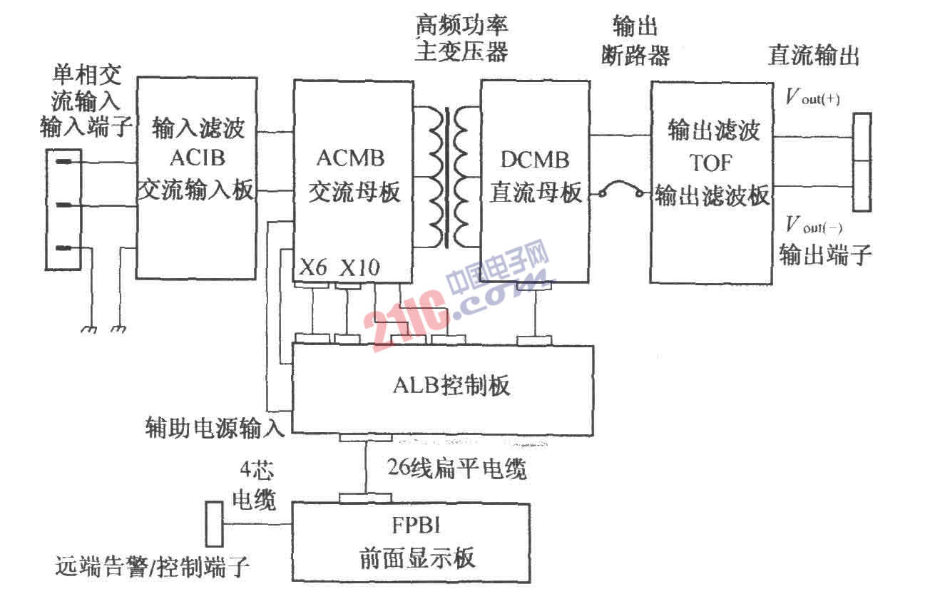 DMA12智能開關(guān)整流模塊由交流輸人板(ACIB)、交流母板(ACMB)、直流母板(DCMB)、輸出濾波板(TOF)、控制板(ALB)、前面顯示板(FPBI)共六塊印制電路板和輸入輸出插頭、斷路器、電感及變壓器等組成,如圖所示。 |