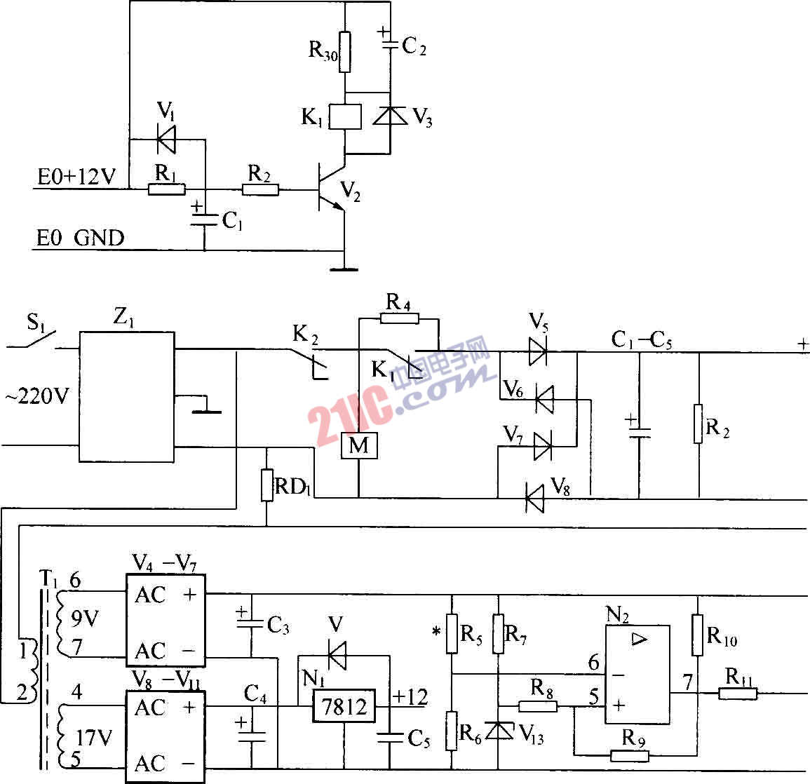 [導(dǎo)讀](1)220V(50Hz)的交流電壓經(jīng)Z1線路濾波器濾波后送到交流過(guò)壓、欠壓保護(hù)繼電器K2的接點(diǎn),正常工作時(shí)K2接點(diǎn)應(yīng)向上閉合,將交流220V電壓接到交流限流電阻R4(開(kāi)機(jī)后延遲一段時(shí)間R4被K1接點(diǎn)短接),送往工頻橋式整流器整流,