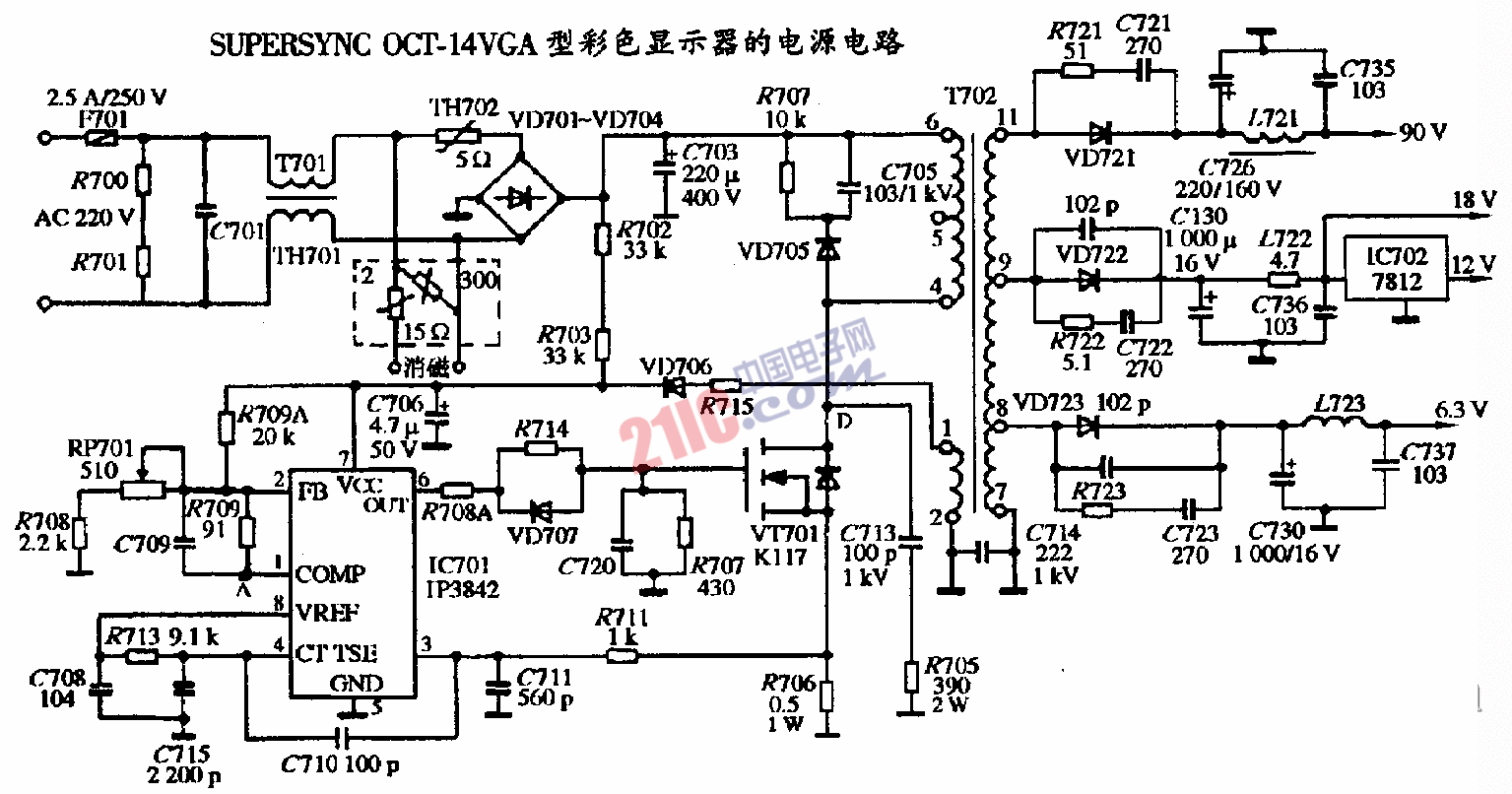 SUPERSYNC OCT-14VGA型彩色顯示器的電源電路圖