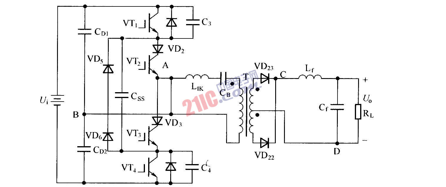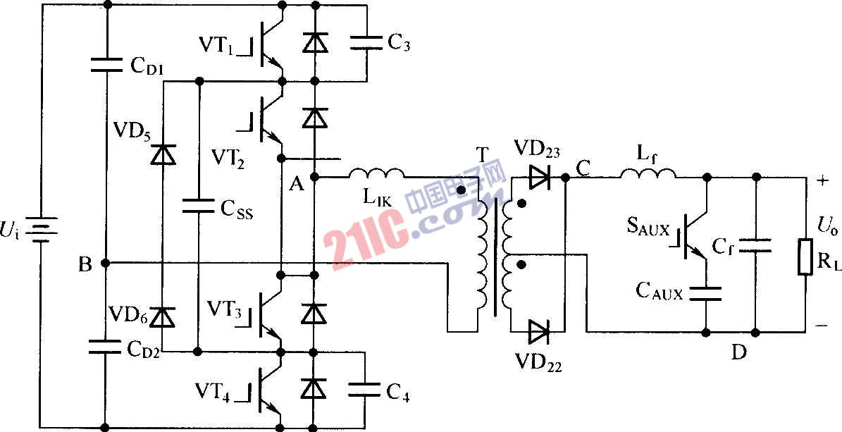 此圖為了防止變壓器一次側(cè)電流在零狀態(tài)時減小到零后繼續(xù)反向流動,在VT2和VT3支路中分別串入二極管VT2和VT3,消除了加入飽和電感后帶來的負作用. |