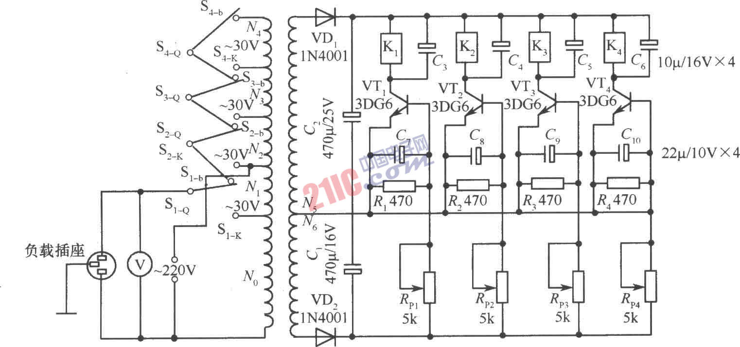 電路如圖所示。它由一只自耦變壓器和四級晶體管控制電路組成。當電網電壓比較正常,為220V左右時,第二級控制電路工作,晶體管VT2導通,驅動繼電器K2吸合,輸出電壓與電網電壓相同,均為220V左右。當電網電壓低于190V時,由于次級電壓降低,迫使VT2截止,K2釋放,VT3導通,K3吸合,使輸出電壓提升了30V。依次類推,直到電網電壓低于130V時,使次級電壓沒有能力使4個繼電器的任何一個動作,輸出電壓提升了90V,輸出電壓為220V。當電網電壓高于240V時,VTl導通,Kl吸合,輸出降低30V。