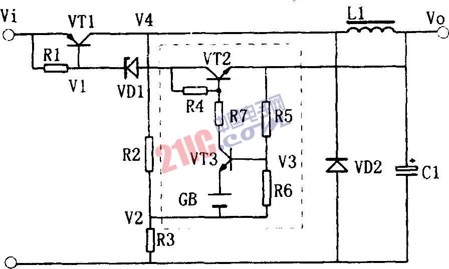 如圖所示為用三端穩(wěn)壓器制作的開關(guān)型穩(wěn)壓電源的具體電路。其工作原理可以通過等效電路圖來理解。由于某種原因,輸出電壓V0略有下降,其在R5和R6上的分壓V3也隨之下降,經(jīng)VT3放大,Ic3減小,Ic2增大,即流過R1和VD1的電流增加,V1下降,導(dǎo)致Ic1增大,V4上升,V4經(jīng)R2和R3的分壓,V2也隨著上升,相對來說又致使V3下降……此過程是一個正反饋連鎖反應(yīng),最后結(jié)果VT1、VT2強烈導(dǎo)通,VT3截止,Ic1對L1及C1充電,逐漸使Vo上升,Vo的上升又將引起一系列正反饋連鎖反應(yīng),經(jīng)過很短時間,Vo便上升到使VT3導(dǎo)通,VT1、VT2截止。L1上存儲的電流通過負載及續(xù)流二極管VD2釋放,使V4下降至零。當(dāng)然Vo也慢慢下降直到第二次翻轉(zhuǎn),即完成自激振蕩的一個周期。整個電路周而復(fù)始地工作于開關(guān)狀態(tài)。