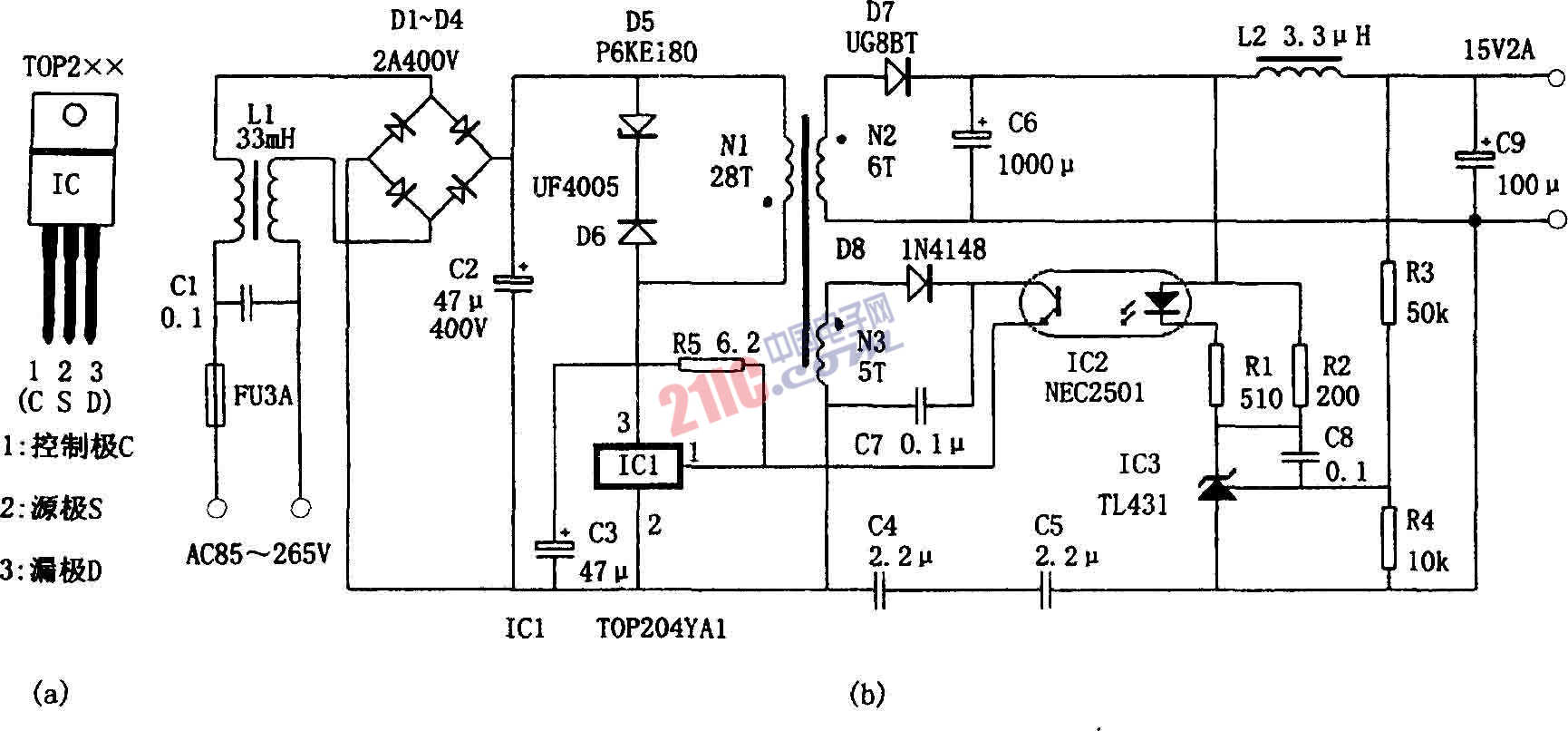 TOP2XX系列IC是一類將控制電路和功率開關(guān)集成在一起的三端開關(guān)電源芯片。這類芯片的封裝形式為TO-220,管腳名稱及功能如圖(a)所示,它們的內(nèi)部設(shè)有振蕩器、PWM比較器、誤差放大器、邏輯電路、高耐壓MOSFET輸出開關(guān)管以及限流、欠壓鎖定電路和過壓、溫度保護(hù)電路。改變注入控制極C(1腳)的電流即可控制芯片內(nèi)輸出MOSFET開關(guān)的占空比。圖(b)所示為TOP204的典型應(yīng)用電路。該電源的技術(shù)特點(diǎn)是輸入電壓為交流85~265V;輸出電壓為15V±2%;額定輸出功率為30W;輸出電壓紋波不大于±50mV;線性調(diào)整率為±2%;效率為85%。電路中,由N3、D8、C7、IC2、IC3、R1~R4和C8構(gòu)成輸出電壓取樣電路,控制IC1輸出脈沖的占空比,從而實(shí)現(xiàn)穩(wěn)定輸出電壓的目的。