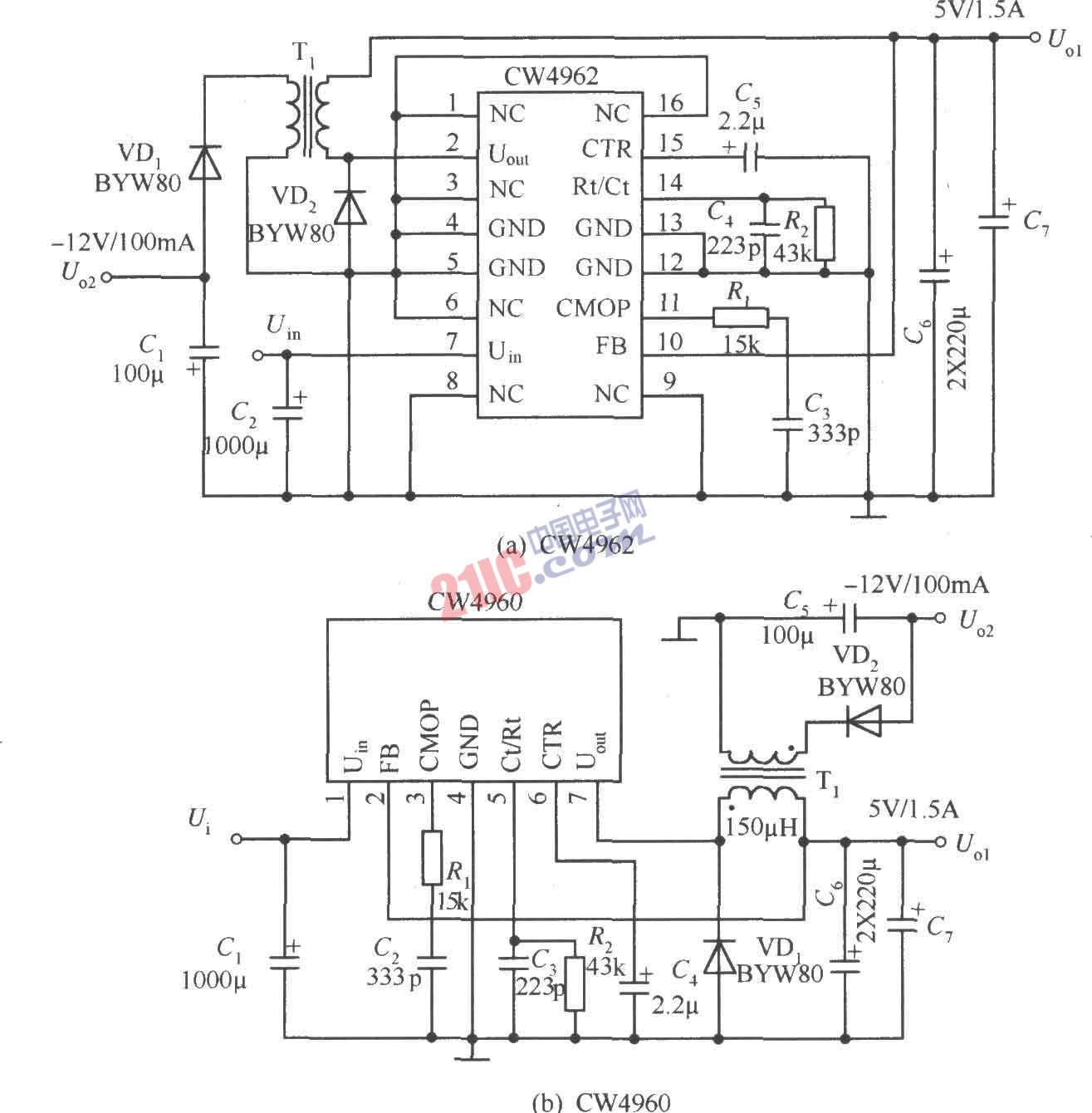 由CW4962、CW4960構(gòu)成的+5V/1.5A、-l2V/100mA的穩(wěn)壓電源電路如圖所示。其中,+5V、1.5A是主電源。在輸出電路中用變壓器代替電感線圈。-12V、l00mA的輔電源是將變壓器二次繞組再整流、濾波后得到。
