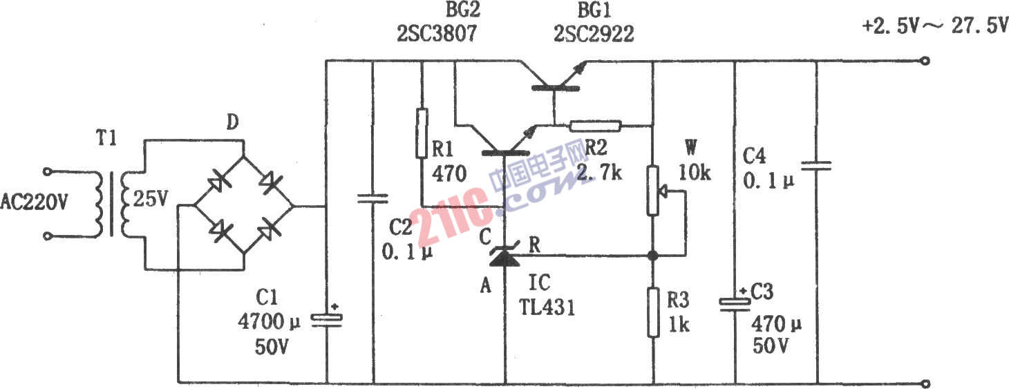 [導(dǎo)讀]如圖所示為一實(shí)用的高精度可調(diào)電源電路。該電路以具有溫度補(bǔ)償特性的、高精度的標(biāo)準(zhǔn)電壓源集成電路TL431為核心,配合復(fù)合調(diào)整管BG1、BG2等元件構(gòu)成穩(wěn)壓電源,輸出電壓在2.5~27.5V之間連續(xù)可調(diào),輸出電流≥5A,電壓紋