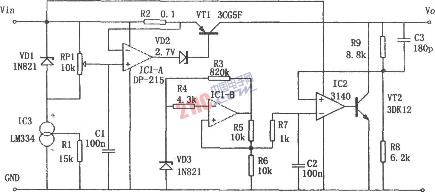如圖所示為一種配合開關(guān)電源進(jìn)行工作的線性穩(wěn)壓電源。其特點是:高效率,低壓差;具有濾除高頻脈動電壓和瞬間突變電壓的能力;最適合于小負(fù)載的需求;具有限流功能。圖中,由VD3、IC1-b等元件產(chǎn)生基準(zhǔn)電壓。R8、R9構(gòu)成電壓取樣電路,對電源的輸出電壓進(jìn)行采樣。IC2和VT2等元件構(gòu)成誤差放大和并聯(lián)電壓調(diào)整電路。通過IC2對基準(zhǔn)電壓與取樣電壓的比較放大,驅(qū)動調(diào)整管VT2,進(jìn)而穩(wěn)定輸出電壓。由VD1、IC3、VD2、IC1-a、VT1等元件構(gòu)成限流電路。VD1、IC3和RP1形成可調(diào)的限流基準(zhǔn)電壓,通過IC1-a對此基準(zhǔn)電壓與R2(輸出電流的取樣電阻)上產(chǎn)生的取樣電壓進(jìn)行比較放大,形成誤差電壓。用該誤差電壓控制調(diào)整管VT1的工作狀態(tài),從而穩(wěn)定和限制輸出電流。
