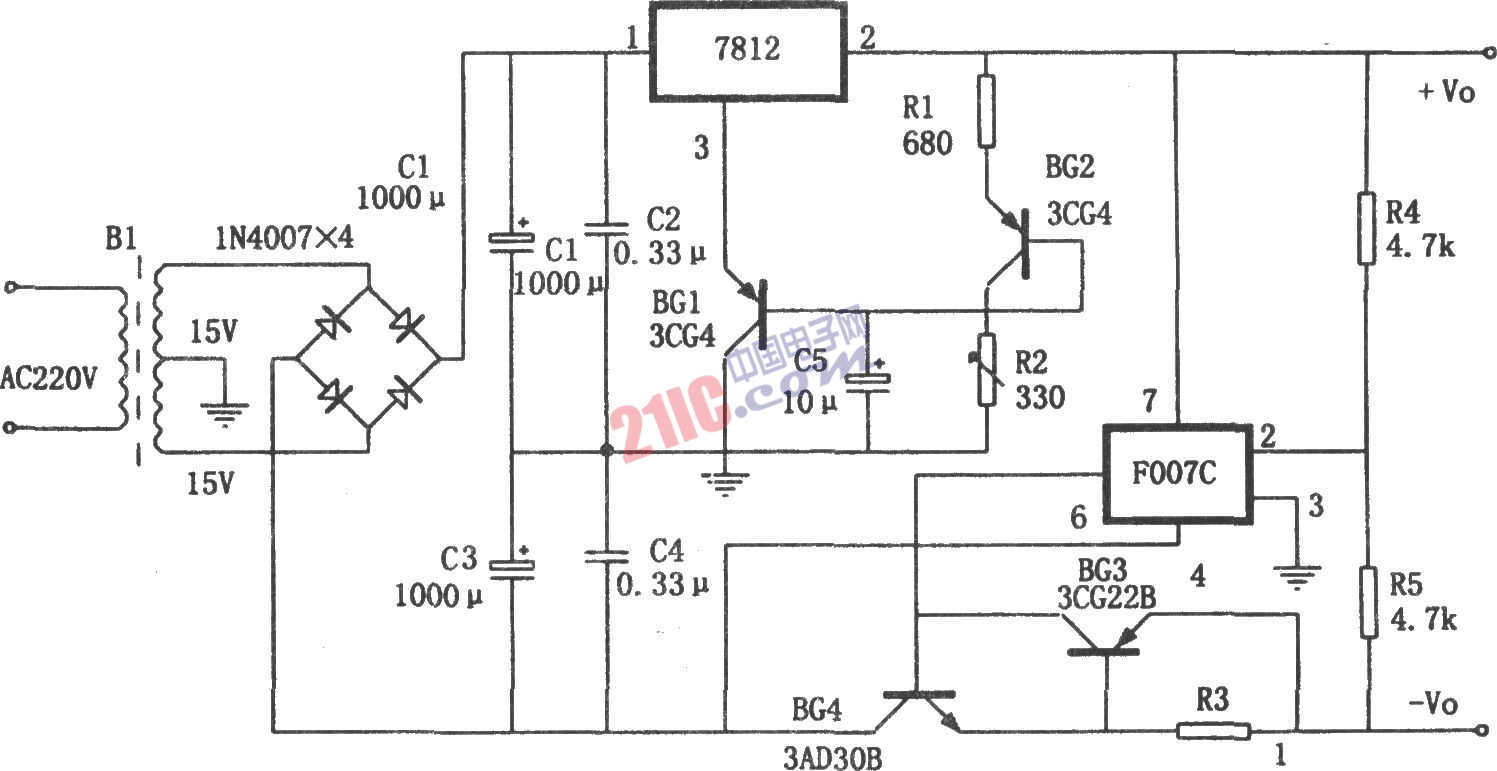 如圖所示是一種帶有溫度補(bǔ)償的、負(fù)電壓跟隨正電壓變化的正負(fù)對(duì)稱集成穩(wěn)壓電源。本電路特點(diǎn)是:在三端穩(wěn)壓器調(diào)壓回路中接有兩只同型號(hào)三極管,利用三極管PN結(jié)的溫度特性進(jìn)行溫度的相互補(bǔ)償,從而使本電源輸出正電壓具有較高的溫度穩(wěn)定性和準(zhǔn)確性。利用運(yùn)放F007C和調(diào)整管BG4(3AD30B),使負(fù)電壓準(zhǔn)確跟蹤正電壓的變化,從而使正負(fù)輸出電壓嚴(yán)格對(duì)稱,并且具有較高的精度。本電源適用于對(duì)正負(fù)電壓的對(duì)稱性要求較高的電子線路。