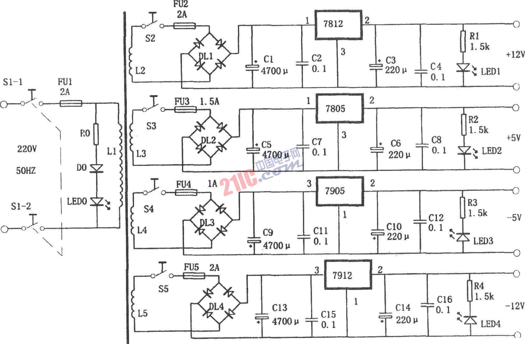 如圖所示為多路輸出的穩(wěn)壓電源電路。該電路利用變壓器的4個(gè)次級(jí)繞組和7812、7805、7905、7912分別提供+12V、+5V、-5V和-l2V 4組相互獨(dú)立的輸出電壓。每組輸出電壓都有單獨(dú)的開(kāi)關(guān)控制和輸出指示。可作為實(shí)驗(yàn)用電源。
