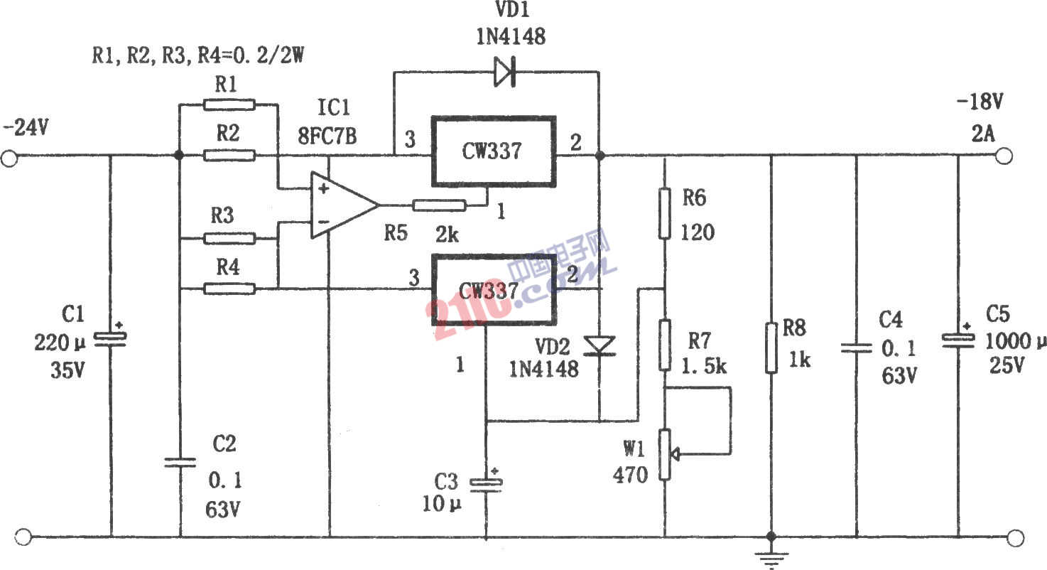 如圖所示為并聯(lián)擴(kuò)流的-18V、2A電源電路。它采用兩只可調(diào)三端穩(wěn)壓器并聯(lián)的方法擴(kuò)展電流。CW337的額定輸出電流為1A,并聯(lián)后輸出電流成倍增加(達(dá)到2A)。此種方法比外接大功率三極管擴(kuò)流法穩(wěn)壓精度高,功耗小。本電路采用運(yùn)算放大器8FC713和R1、R2、R3、R4取樣電阻等元件來自動(dòng)平衡兩只CW337的輸出電流。本電源的輸出電壓為一18V+0.5,電壓紋波不小于15mV。