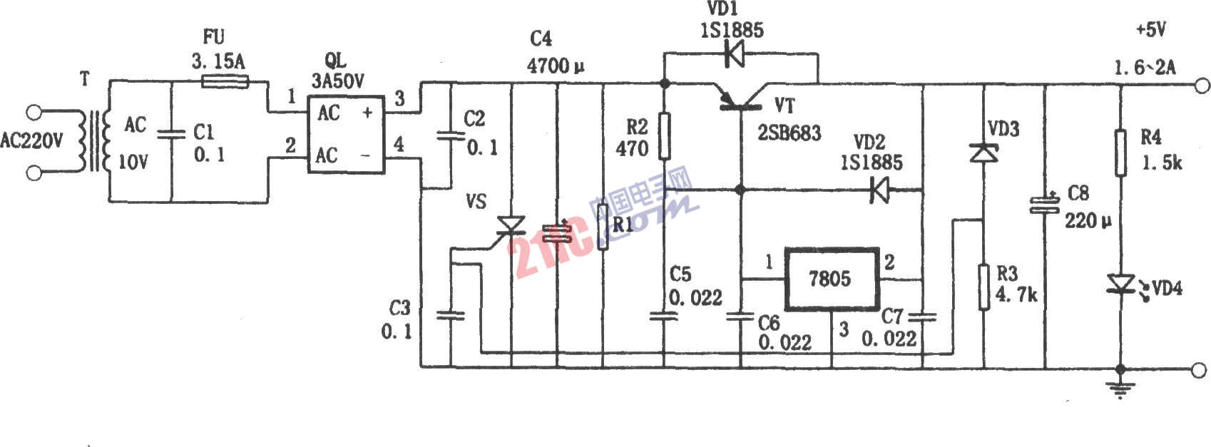 如圖所示為一種具有擴流和過壓保護功能的+5V穩(wěn)壓電源電路,它采用在三端穩(wěn)壓器7805(最大電流1.5A)上跨接大功率三極管的方法擴展電流,使本電源的輸出電流可達到2.5A左右。同時用5.6V穩(wěn)壓管、VD3、R3和Vs(可控硅)組成過壓保護電路。由于某種原因電源的輸出電壓達到或超過5.6V(VD3的穩(wěn)壓值)時,VD3將被擊穿導(dǎo)通,可控硅Vs得到觸發(fā)電壓而導(dǎo)通,造成FU保險絲快速熔斷。從而保護了負載。本電源可作為實驗電源。