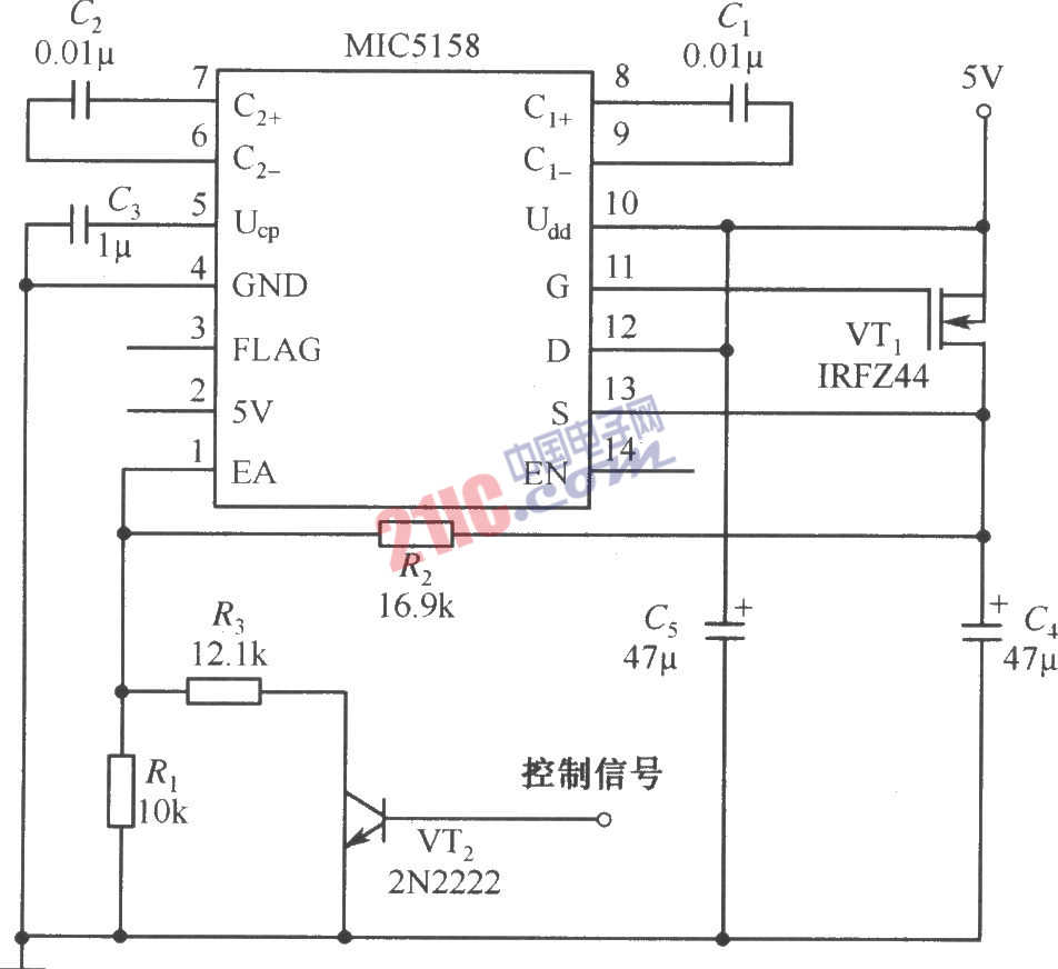 由MIC5158構(gòu)成的輸出電壓可選擇的線性穩(wěn)壓器電路如圖所示。在該電路中,當輸入控制端的電壓為高電平時,輸出就為5V;當輸人控制端的電壓為低電平時,輸出就為3.3V。