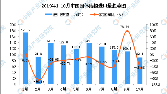最新數(shù)據(jù)顯示,2019年10月中國固體廢物進口量為89.4萬噸,同比下降45.6%。