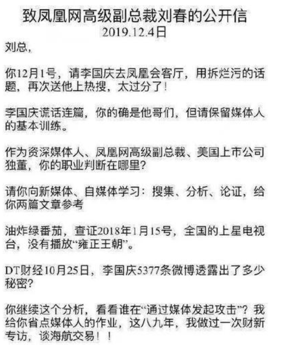 俞渝在公開信中怒懟劉春,稱“你12月1號(hào),請(qǐng)李國慶去鳳凰會(huì)客廳,用拆爛污的話題,再次送他上熱搜,太過分了!李國慶謊話連篇,你的確是他哥們,但請(qǐng)保留媒體人的基本訓(xùn)練。”